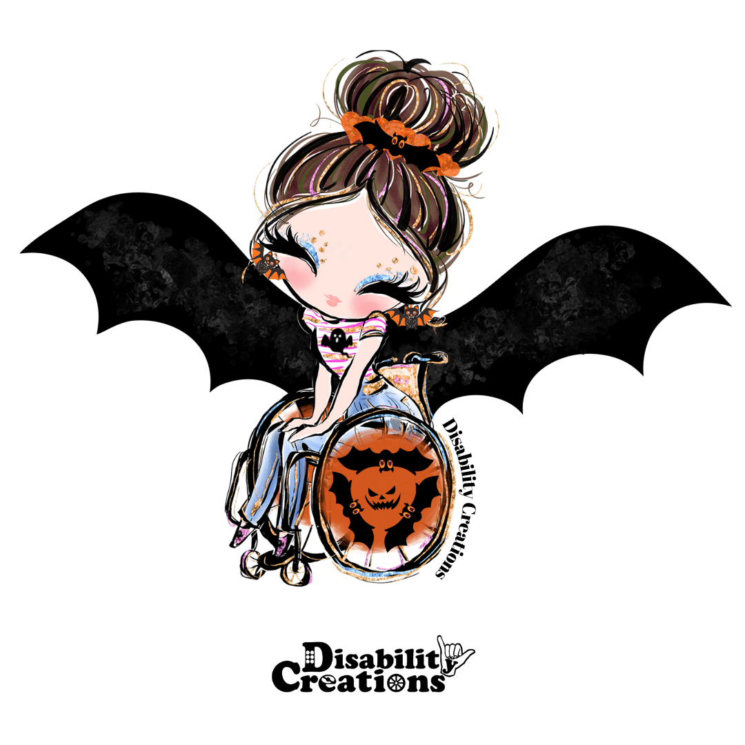 Sticker Description: A sticker of a lady dressed as a bat, her bat wings are open, and her wheelchair's wheels have three bats shaping a circle and making a pumpkin in the middle.