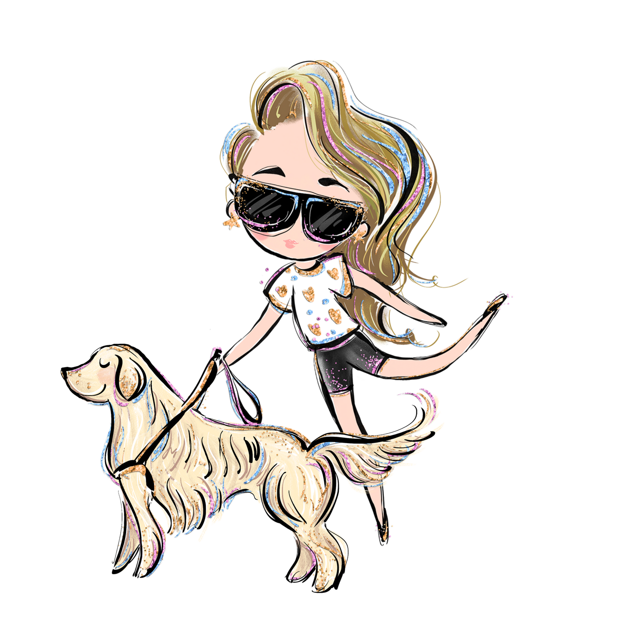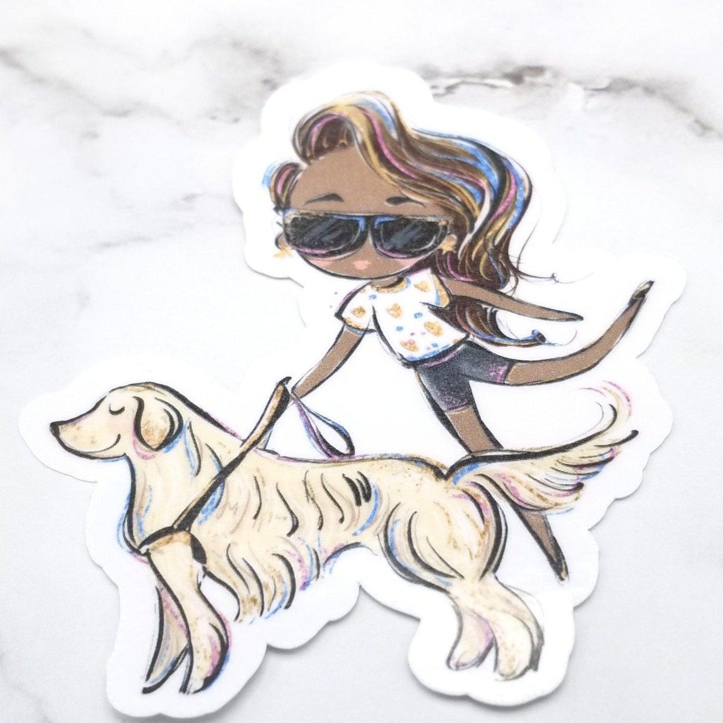 Description: A cartoonish style vinyl sticker features a confident, stylish blind woman with long, flowing hair, highlighted with streaks of blues, purples, and blond. She's gracefully walking on her tippy toes while walking with her service animal, a Golden Retriever. She wears oversized black sunglasses, a floral top, and black shorts representing disability pride in full color.